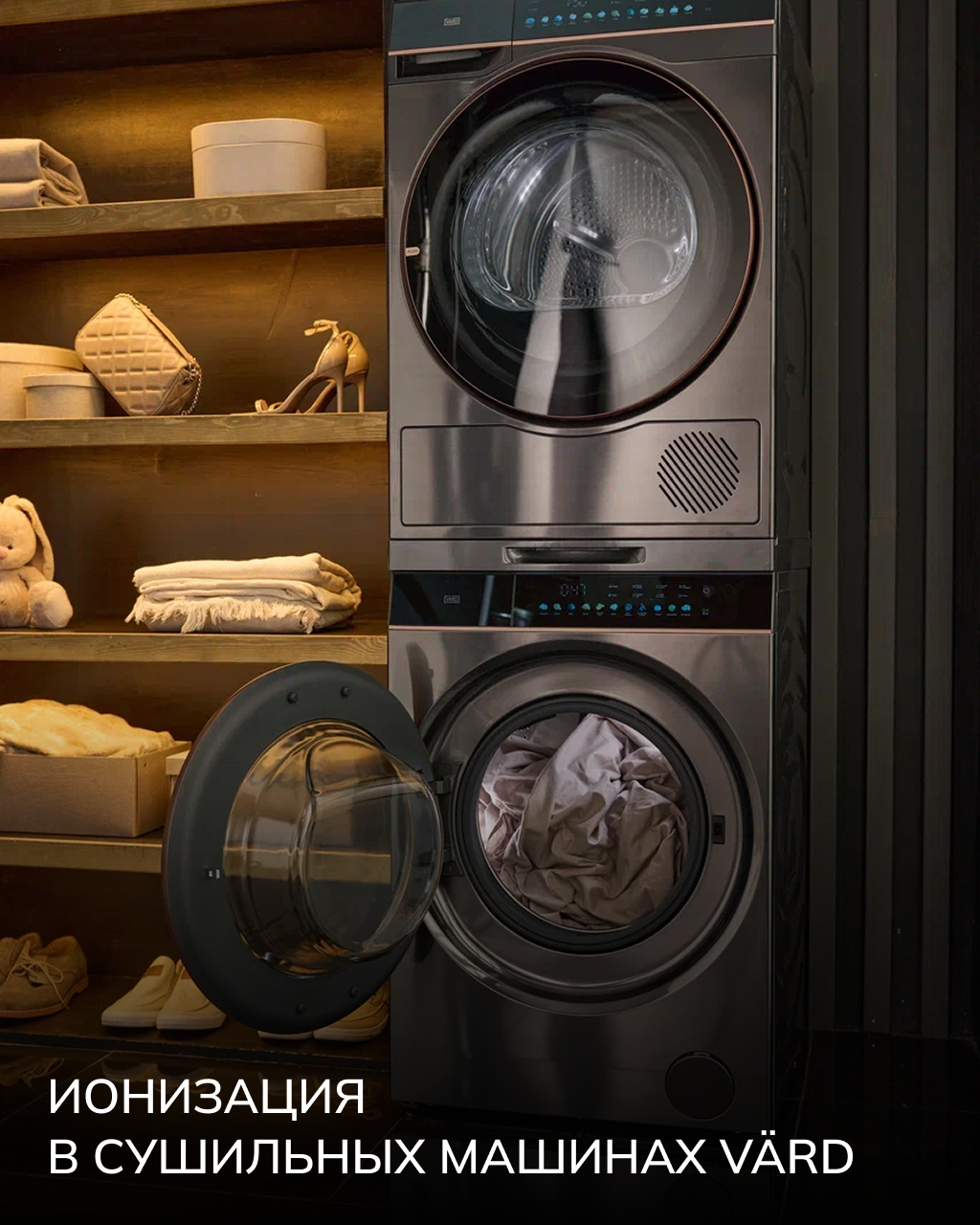 В сушильных машинах VÄRD VTH61 и VTH61B встроен генератор ионов, который создаёт поток отрицательно заряженных частиц. Они действуют на уровне микрочастиц — связываются с пылью, устраняют запахи и подавляют развитие бактерий.